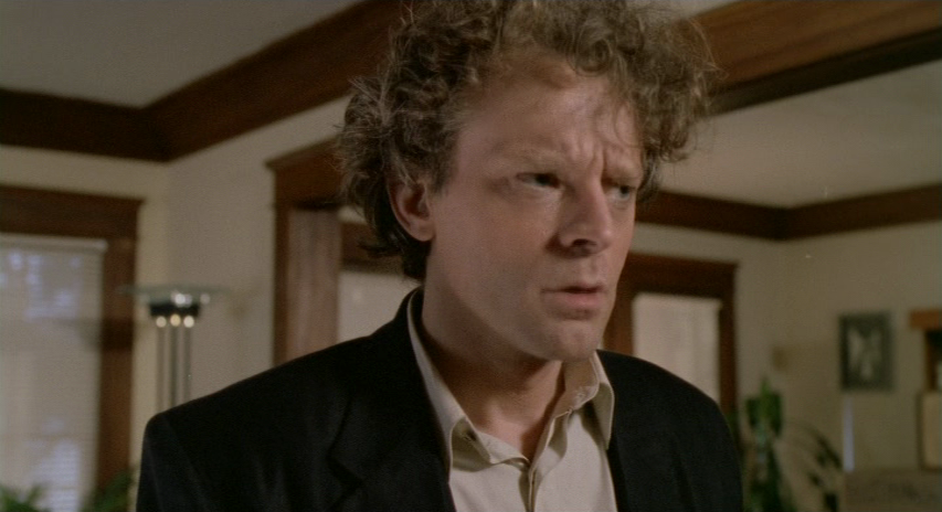 Dr. Parsons shows Sam tuning into a program he earlier had no kind words for. The telephone conversation with Lou brims with the warmth of the past, but Brad Dourif expertly embodies Sam's current feelings about his relationship with Lou, as being something on the periphery of his life now (though even the witchy ex-wife - Lou's own daughter - admits to him: "He asks about you all the time," as if the old man's preference is clear). "Of course I'll have lunch with you," Sam tells him - then hangs up a second later. In both cases, Sam is a duality, just as the space is a duality and the scene is made up of dualities.