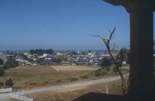 And we can characterize as "masculine" the dissolution from "concept shots" back to sturdy narrative. Straker leaves his car, walks across the street, and we cut to Constable Gillespie reacting to his approach, glimpsed through double-door blinds.